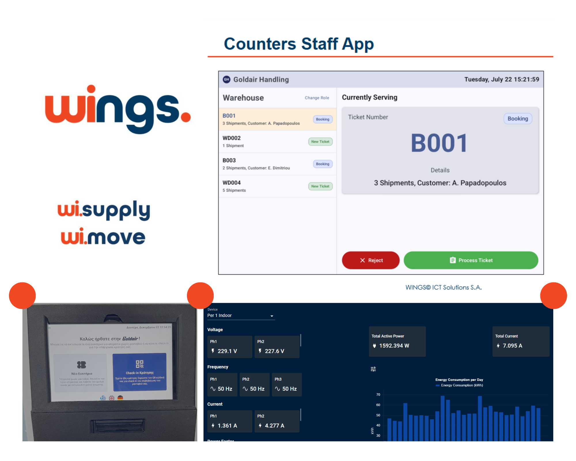 In parallel, the WINGS ICT Solutions Energy Management System provides centralized and continuous monitoring of energy consumption, collecting data from smart meters installed across critical infrastructure, including cooling systems, air conditioning, lighting, and vehicle charging stations. Via the wi.supply platform, data is analyzed in real time, delivering actionable statistics, alerts, and reports that support informed decision-making to reduce energy costs, prevent failures, and enhance environmental responsibility.